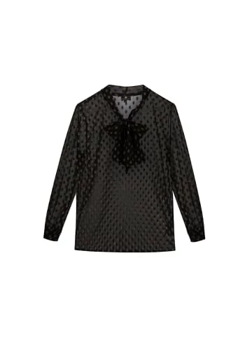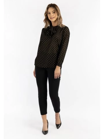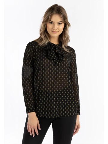 Die Schluppenbluse von DreiMaster Klassik setzt Sie ist zeitlos und edel in Szene. Sie ist die perfekte Mischung aus elegant und leger, wobei Sie die Wahl haben, ob sie die Schluppen zur Schleife gebunden tragen möchten oder leger offen. Das elegante italienische Design besticht durch seine semitransparente Optik sowie durch die metallic-goldglänzenden Tupfen auf schwarzem Untergrund. – Elegante Schluppenbluse – Semitransparentes Material – Goldfarbene Metallic-Tupfen – Lange Ärmel mit Manschetten – Made in ItalyGrößenhinweisL